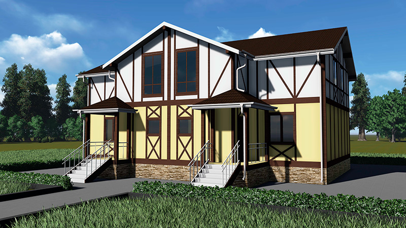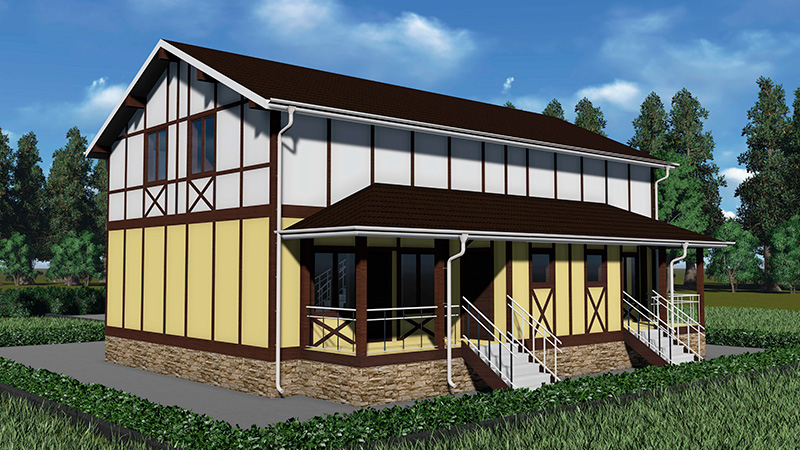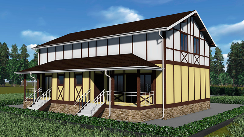 Наружная отделка —декоративная штукатурка, облицовочная рейка в местах стыка